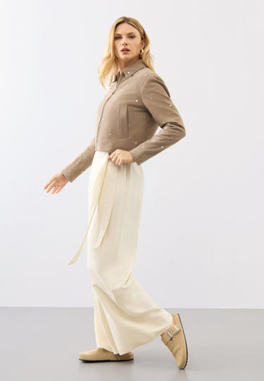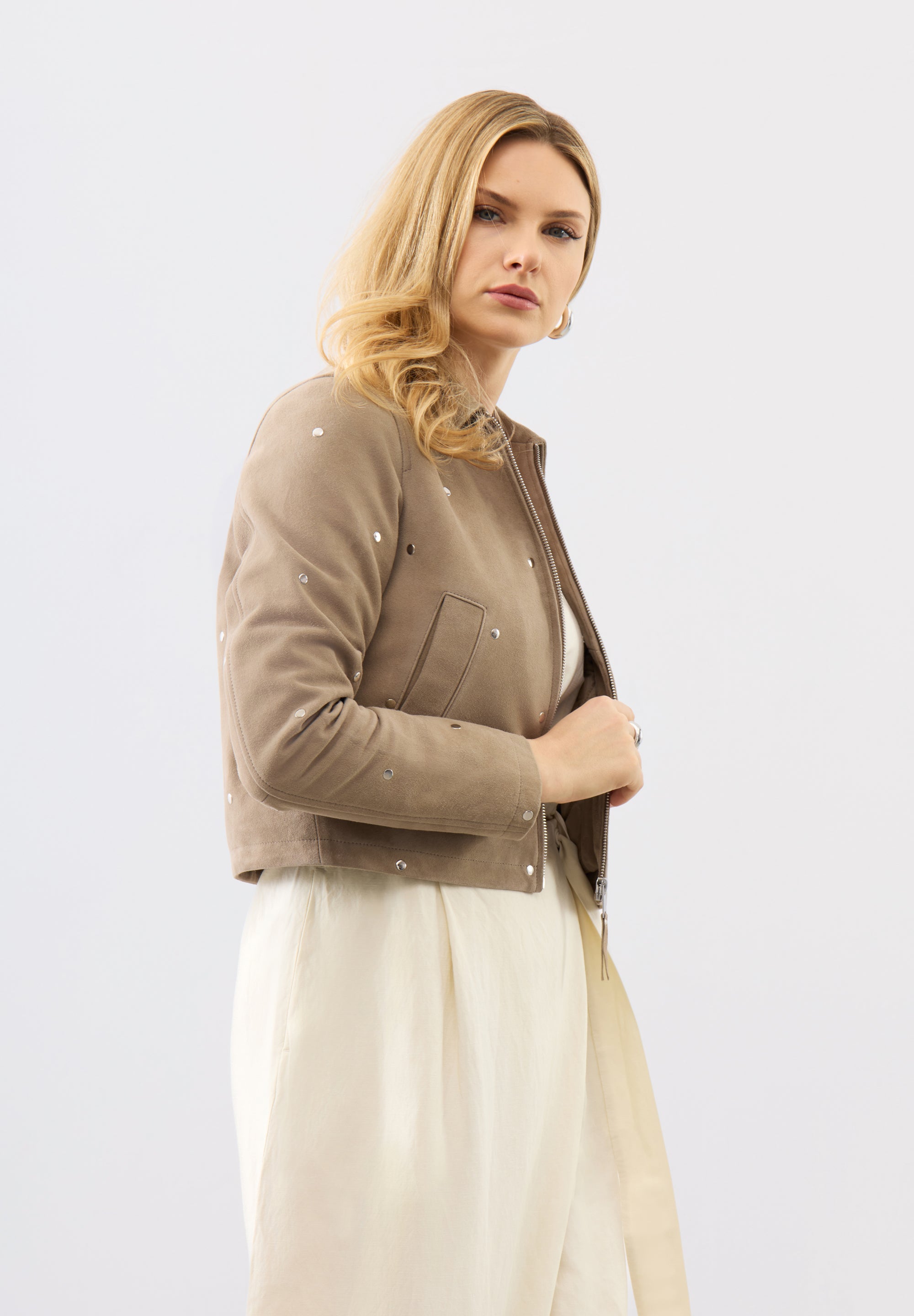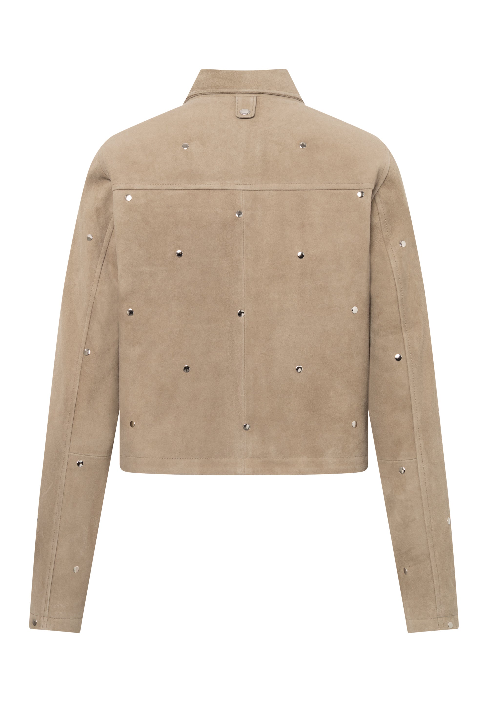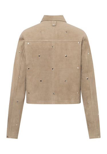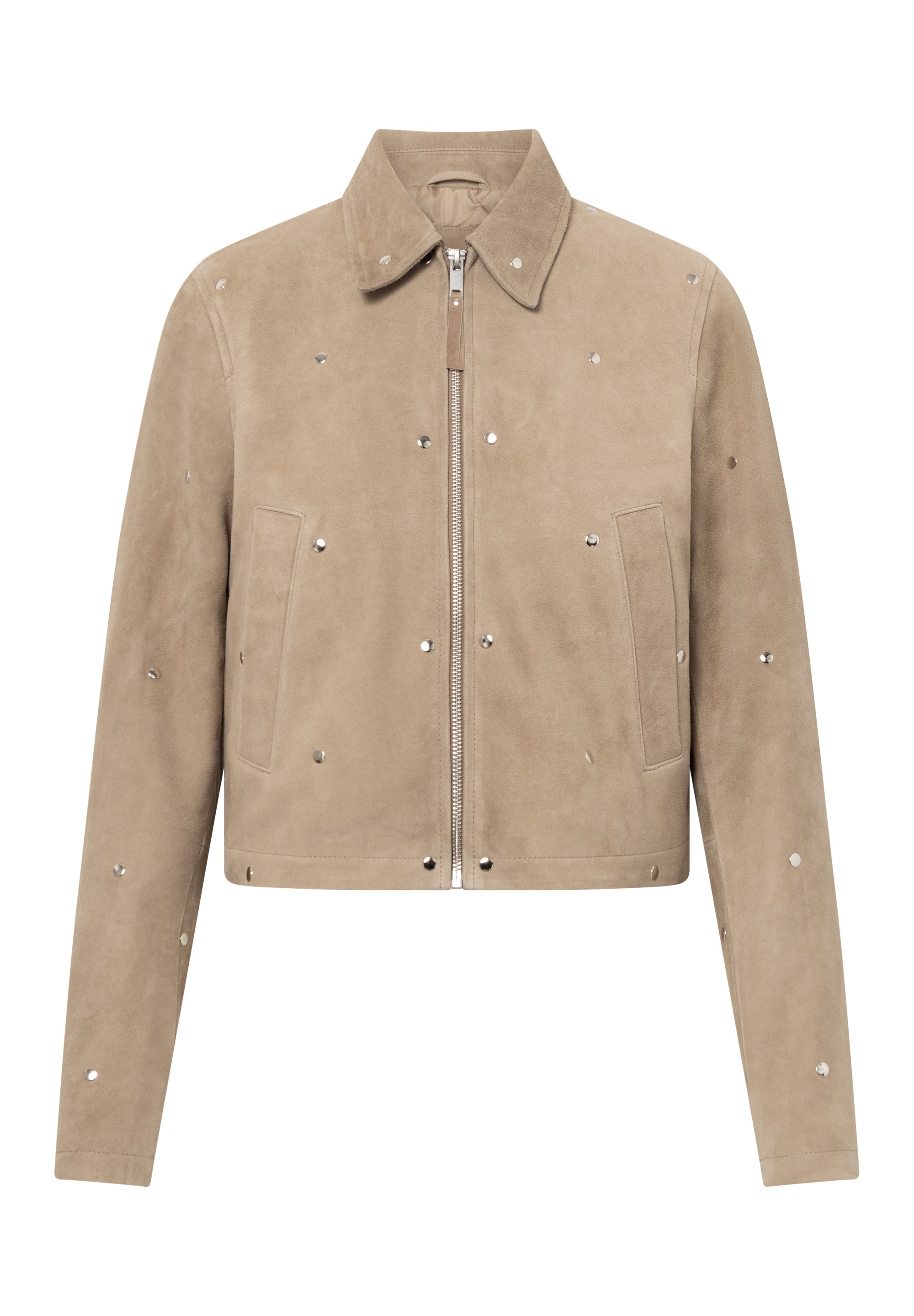 Zip through jacket from Bolongaro Trevor in real suede, with a soft touch and hand feel. This jacket features a shirting style collar, zip front front fastening, stud detailing throughout and side pockets.