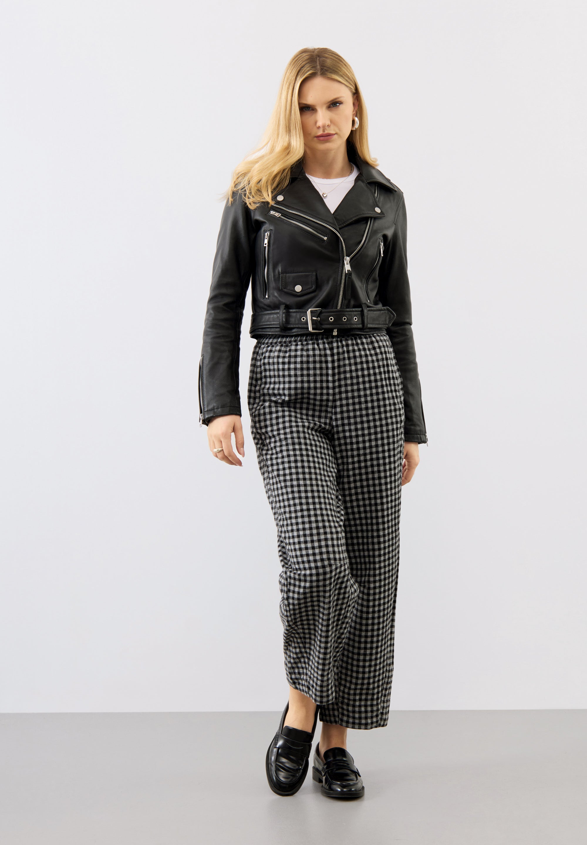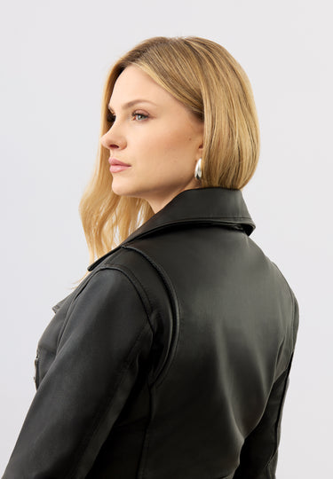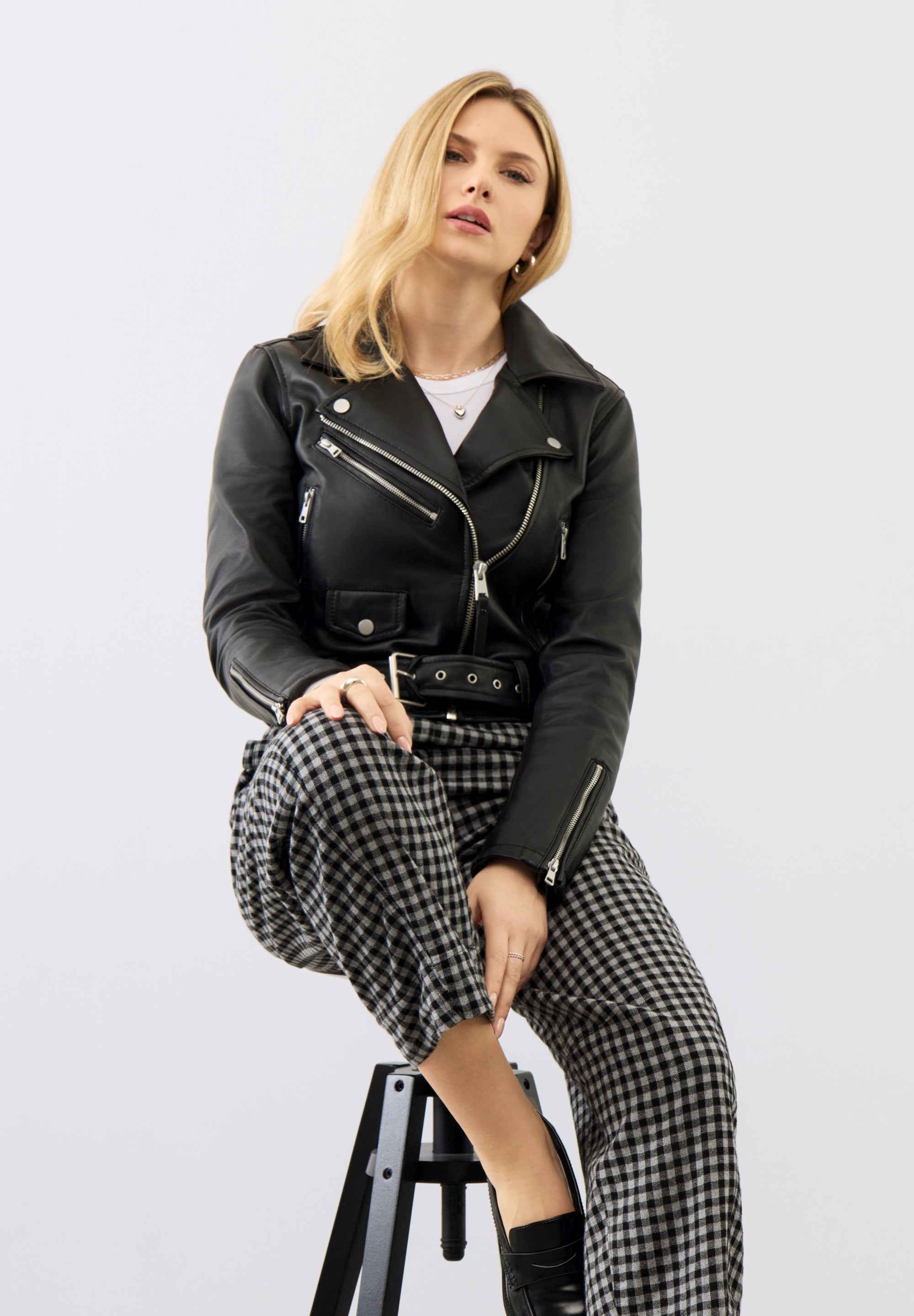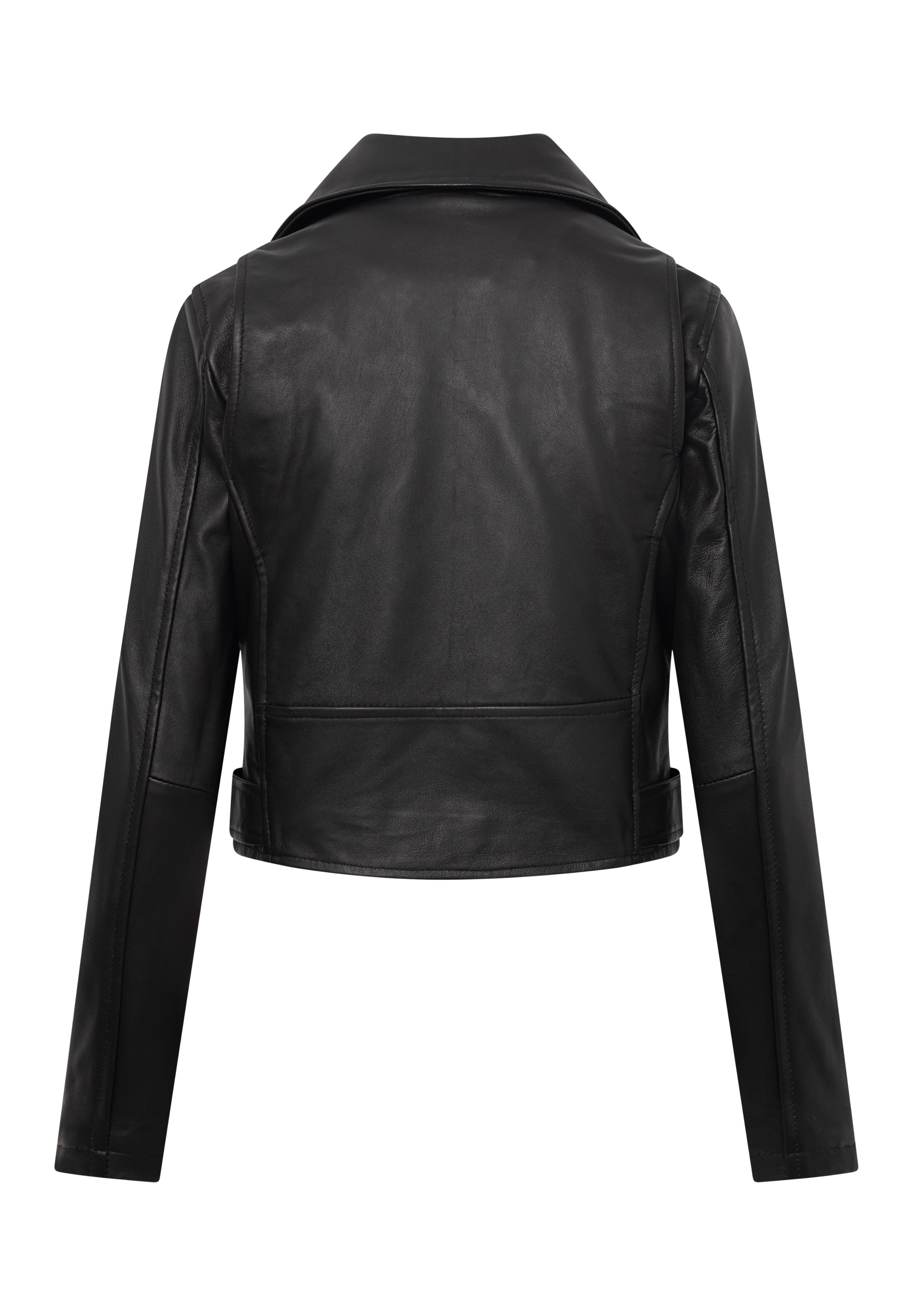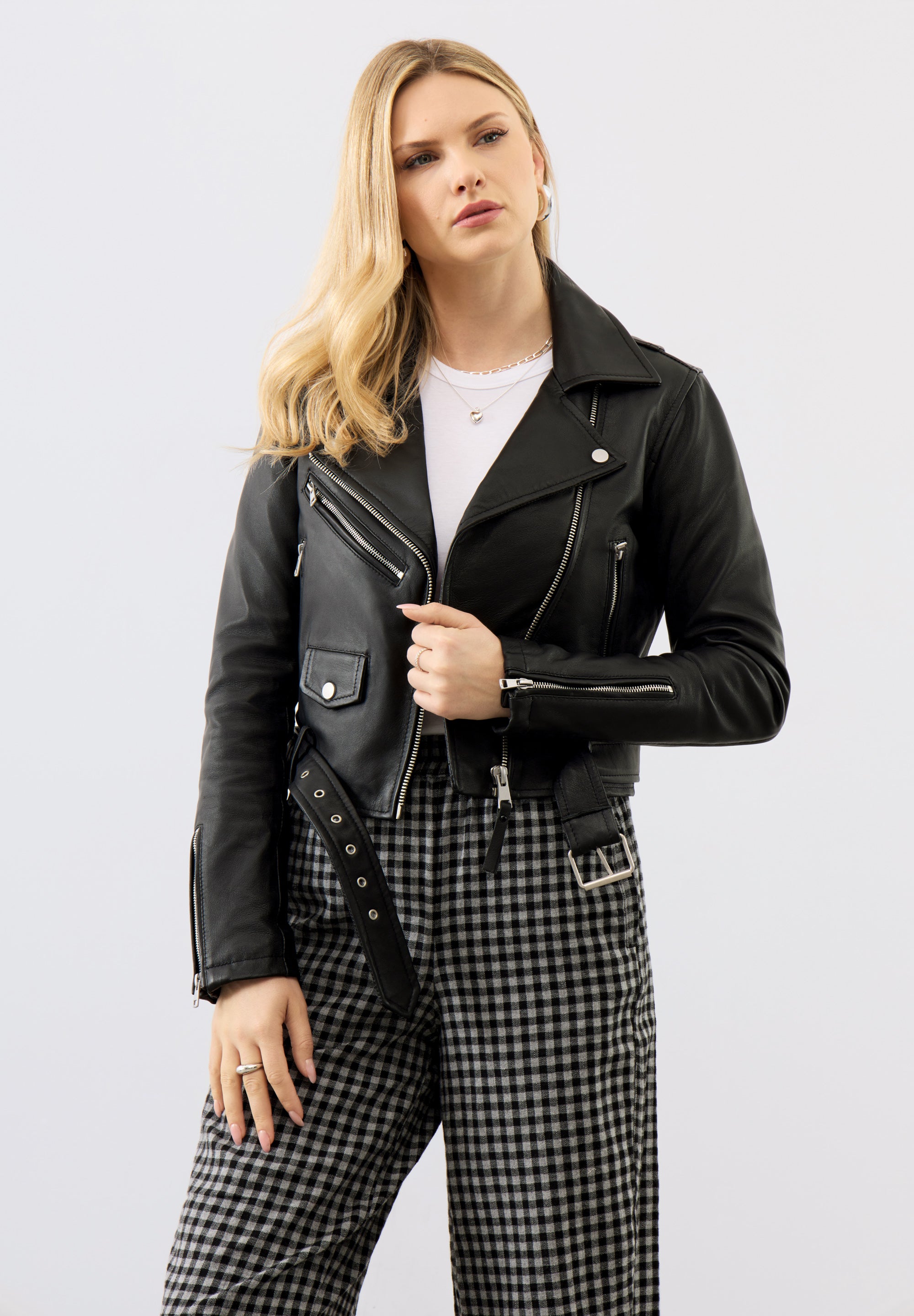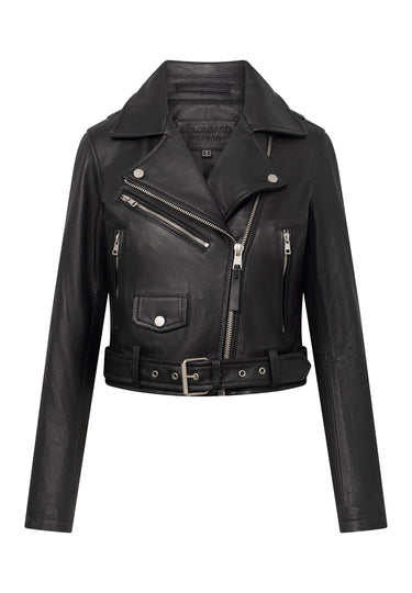 Biker jacket from Bolongaro Trevor in real leather, with a soft touch and hand feel. This biker features a notch lapel, asymmetric front, zip front, coin pouch, belted waist, zip pockets and zip cuffs.
