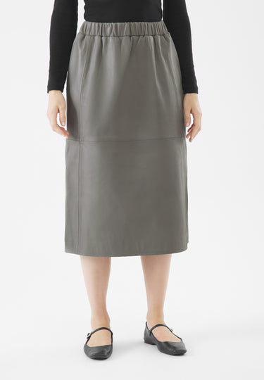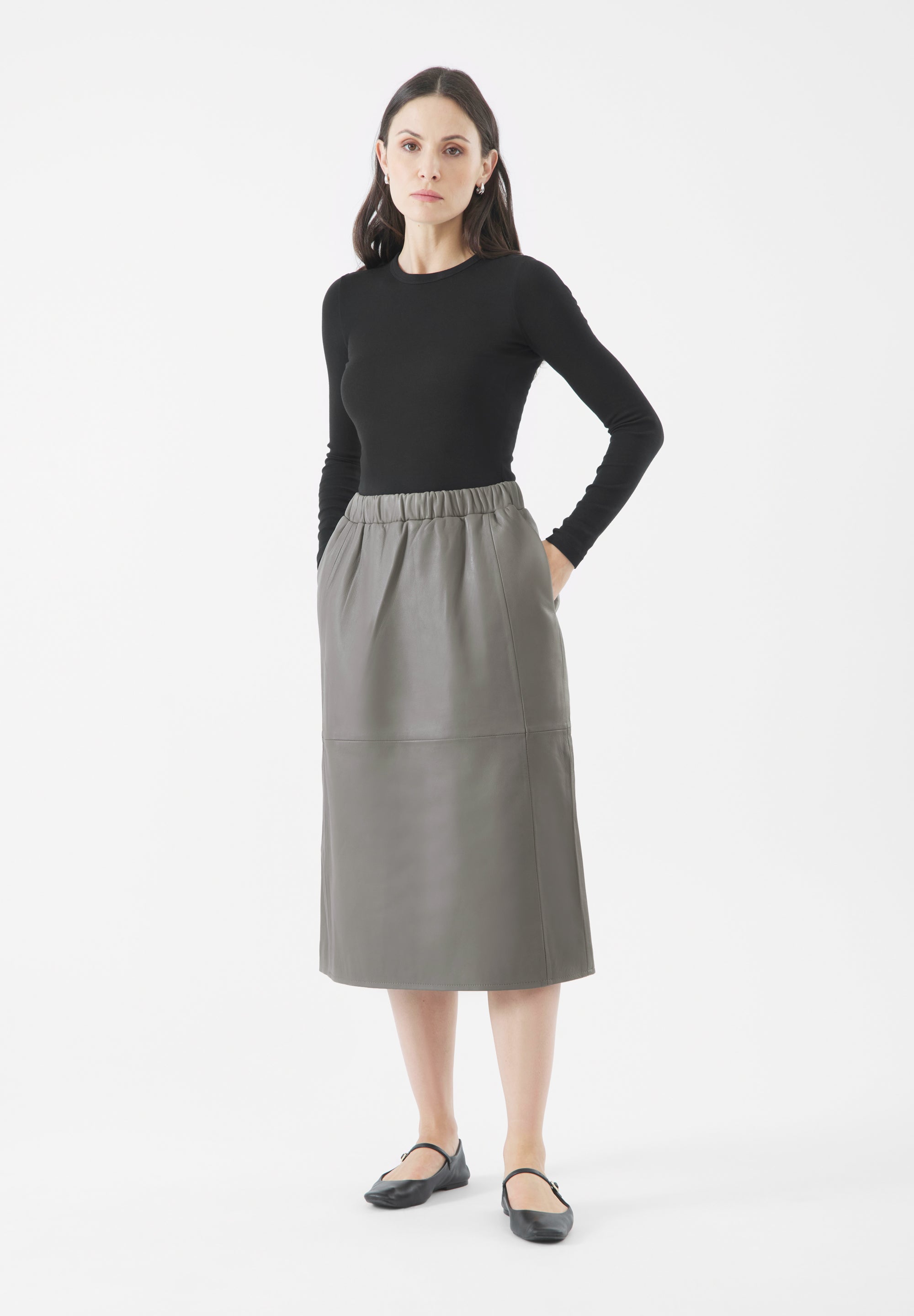 Elasticated waist midi skirt from Bolongaro Trevor in soft real leather. This skirt features a relaxed fit, with a comfortable elasticated waistband and two side entry pockets. This skirt will last the test of time aging with you developing its own unique character.