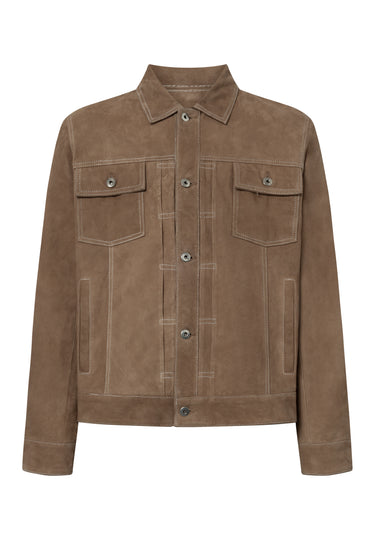 Trucker jacket from Bolongaro Trevor in soft real suede. This jacket features a classic collar, shank button fastening, front pleat detailing, flap chest pockets, side entry pocket and snap cuffs. This jacket will last the test of time aging with you developing its own unique character.