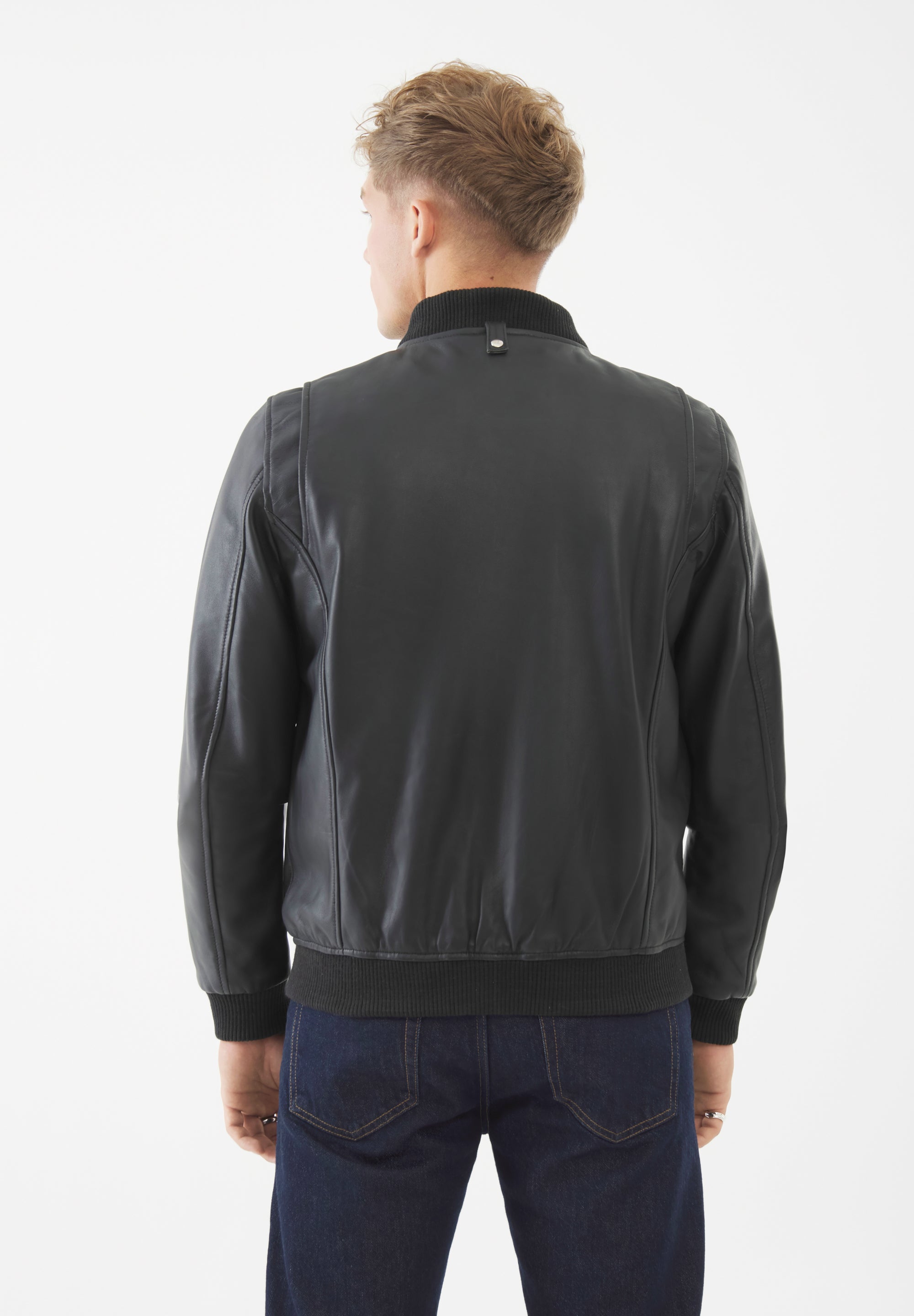 Bomber jacket from Bolongaro Trevor in soft real leather. This classic bomber features a classic rib bomber collar, two way zip front, zip pockets, rib hem and cuffs. This jacket will last the test of time aging with you developing its own unique character.