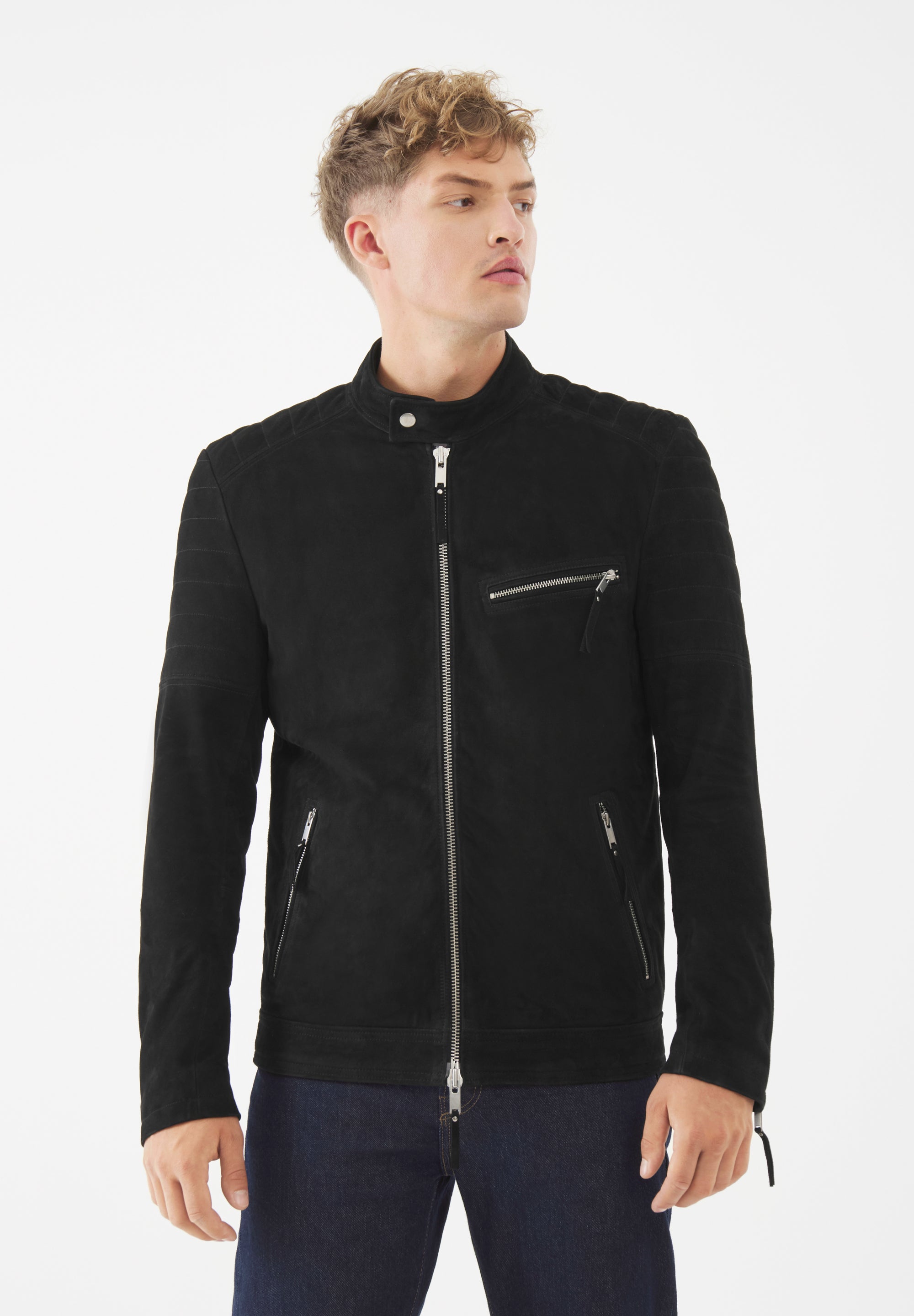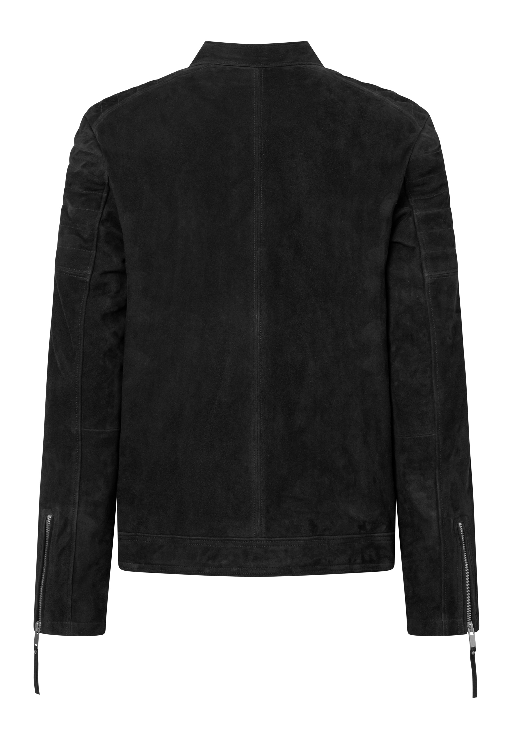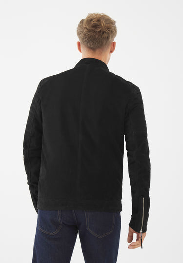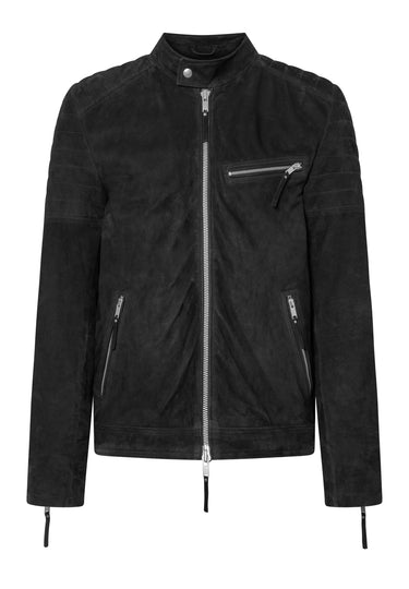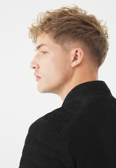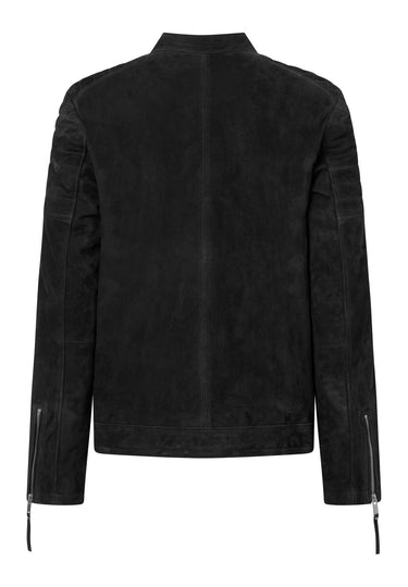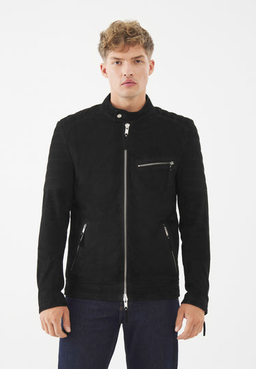 Zip through racing jacket from Bolongaro Trevor in soft real suede. This jacket features a racing collar, shoulder panel detailing, two way zip front fastening, zip pockets and cuffs. This jacket will last the test of time aging with you developing its own unique character.